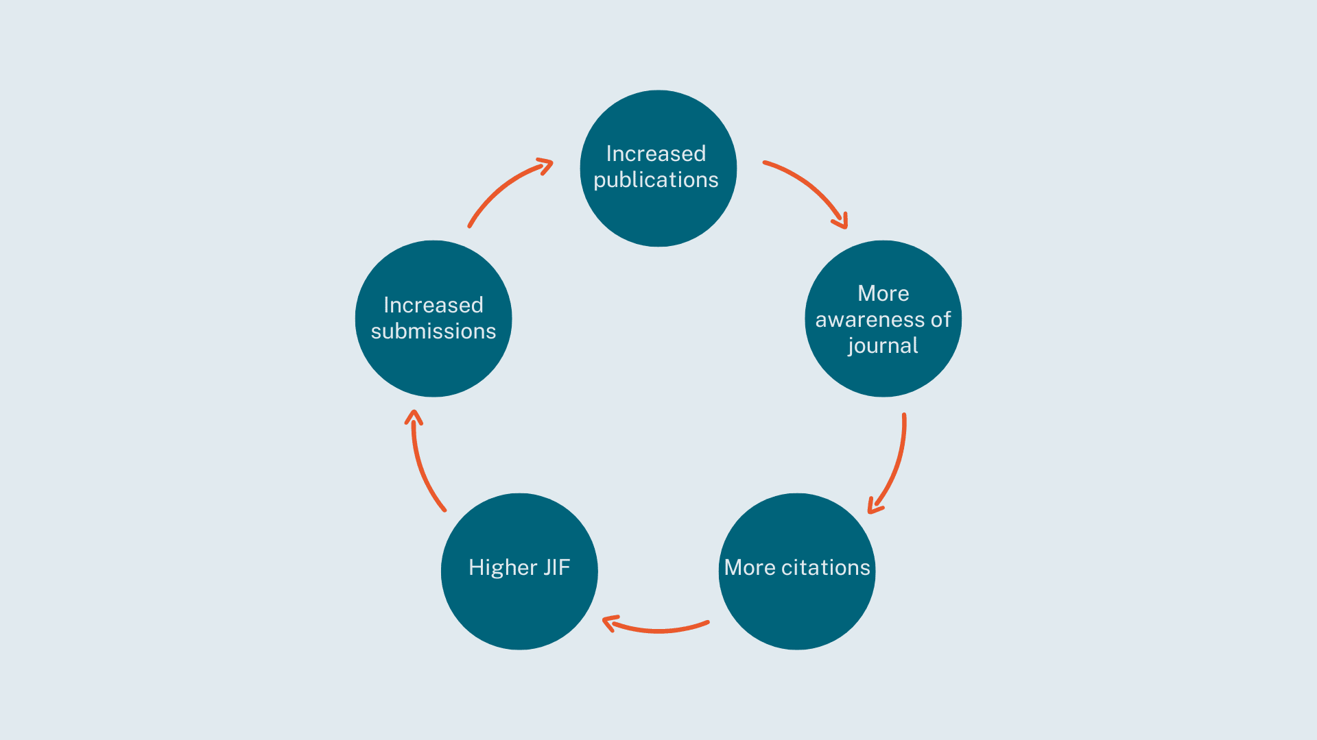 But that’s not what Pep observed, so what's going on? Pep provides some possible explanations in his editorial. My hunch (and it is just a hunch) is that the more papers a journal publishes, the more authors become aware of the journal. This increased visibility may increase the likelihood that the author cites the journal, which increases the number of citations (and hence the JIF). This, in turn, results in more submissions. In other words, it’s a perfect example of Jim Collins’ flywheel effect.