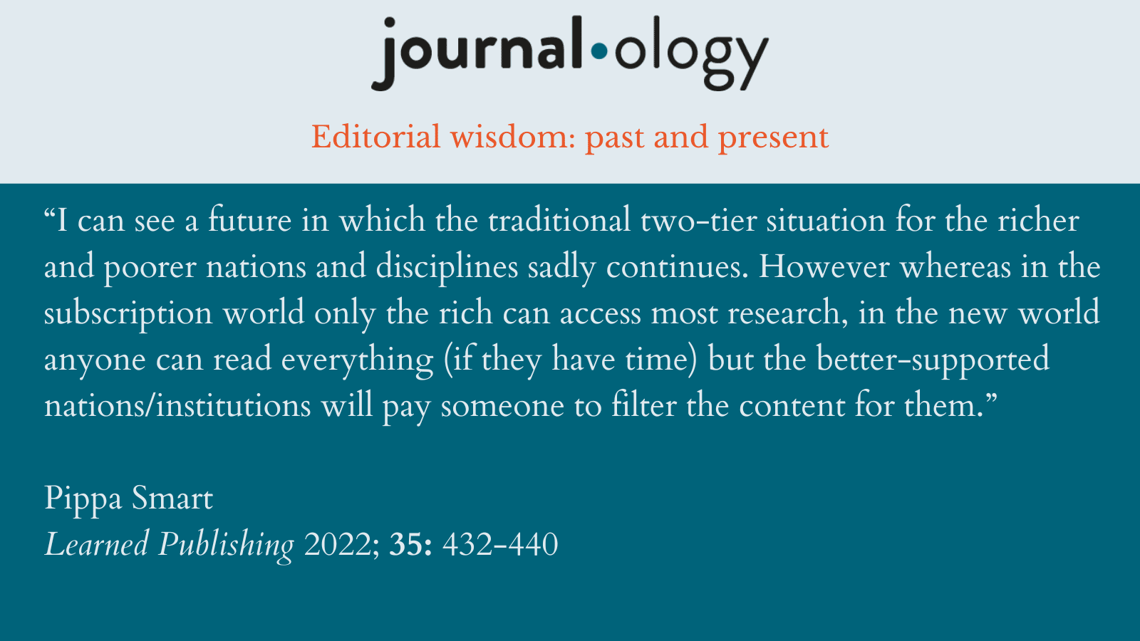 The October issue of Learned Publishing came out a few days ago, the last issue that Pippa Smart edited. The issue contains an interesting article on The past, present and future of publishing: Observations to celebrate ALPSP's 50th year and so I thought it might be a nice idea for this week’s piece of editorial wisdom to be taken from Pippa’s contribution to that article.
